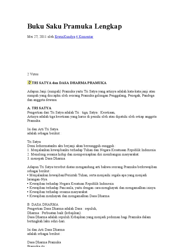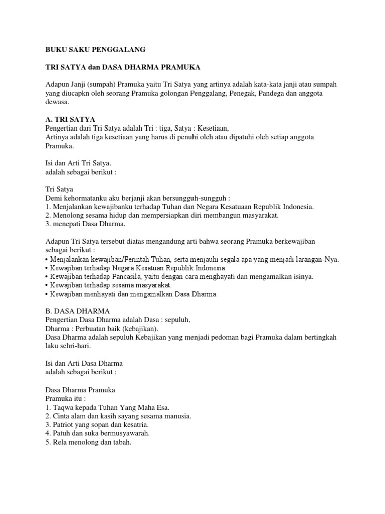 Doc Tri Satya Dan Dasa Dharma Pramuka Muassomah 22 Academia Edu - Sedangkan tri satya merupakan tiga kesetiaan yang harus di patuhi oleh setiap anggota pramuka.