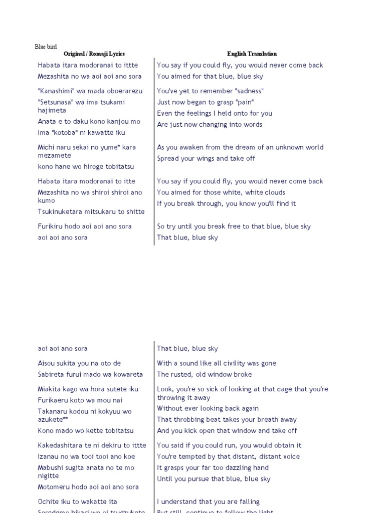 Naruto Blue Bird Lyrics English / This song expresses freedom and knowledge of a bird and its experiences.